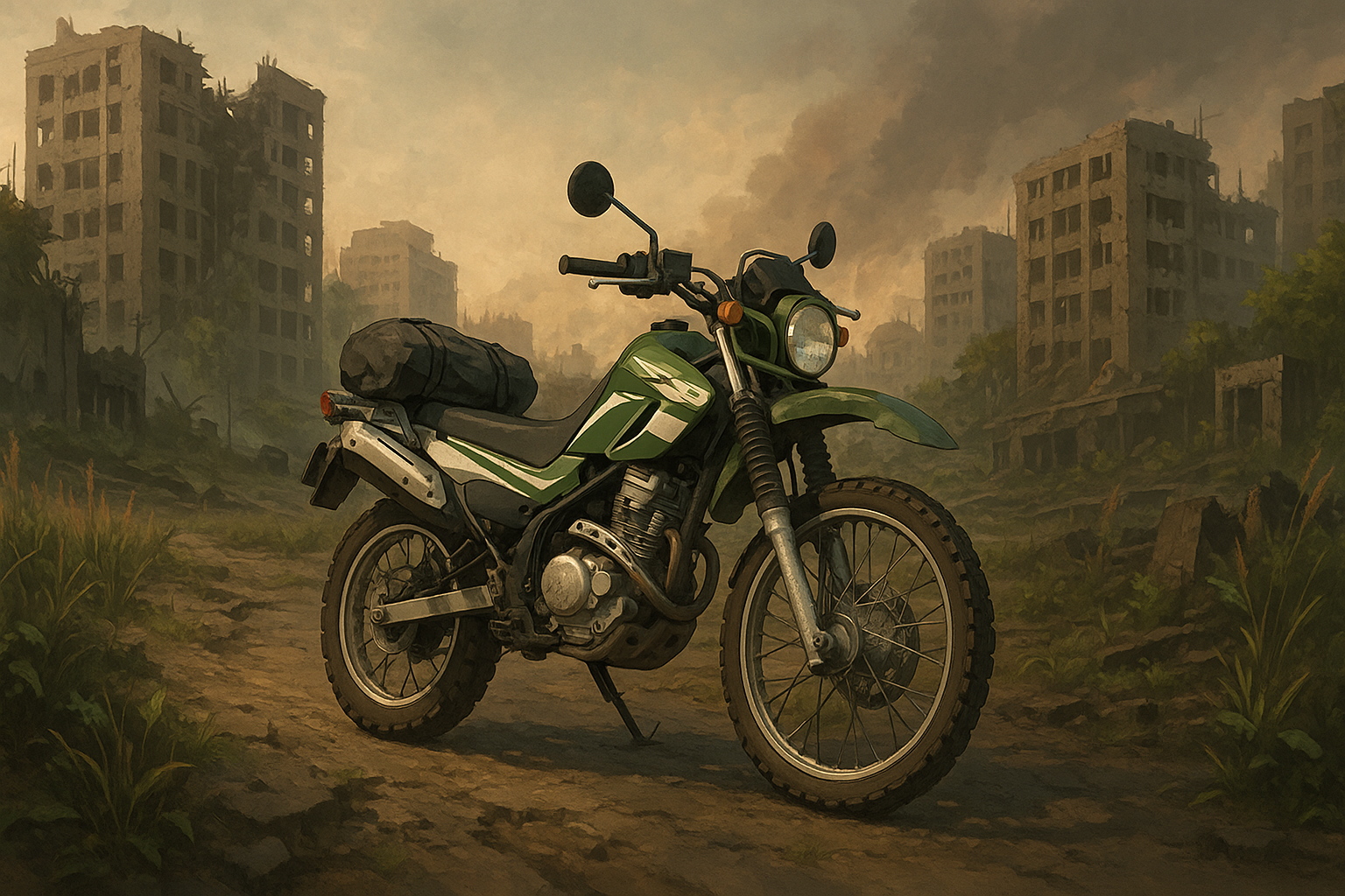 終末世界では舗装道路が割れ、雑草に覆われ、瓦礫が散乱する。そんな道を軽快に走り抜けるには、オンロード特化のバイクでは役不足だ。
