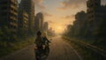 廃墟になった街を抜け、雑草が生い茂る道を進むシーンは、まさにツーリングそのもの。